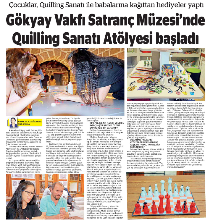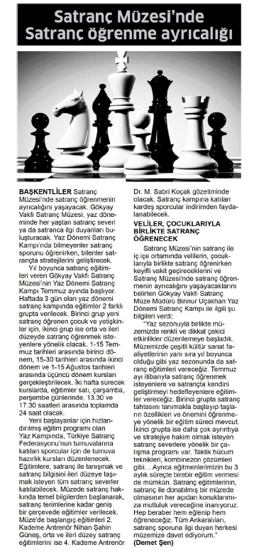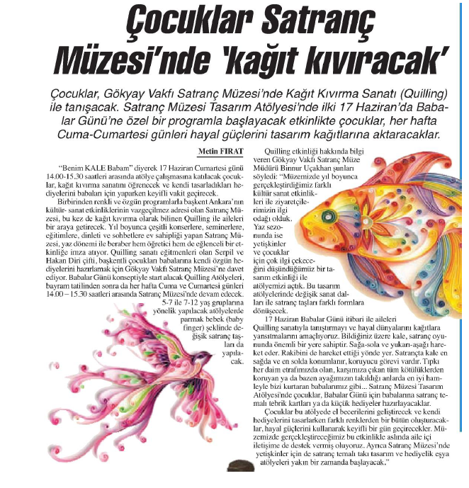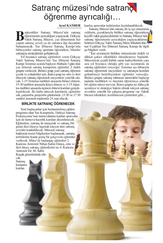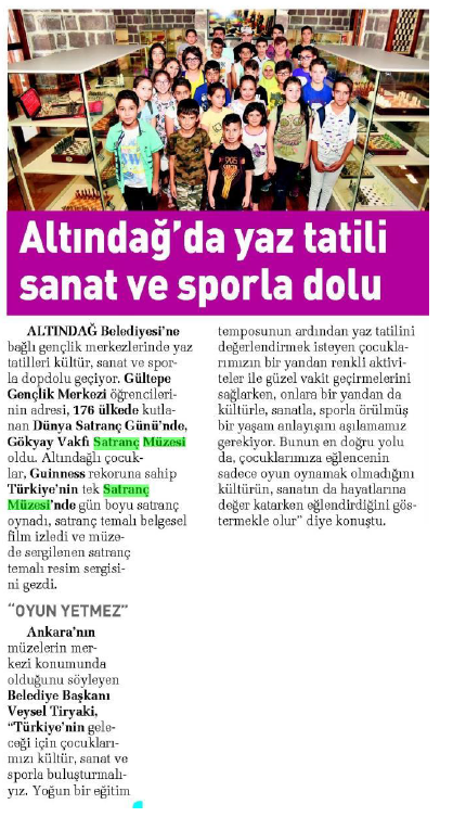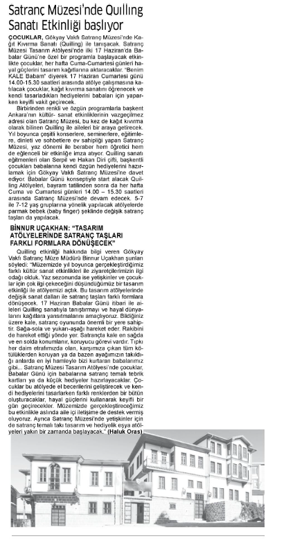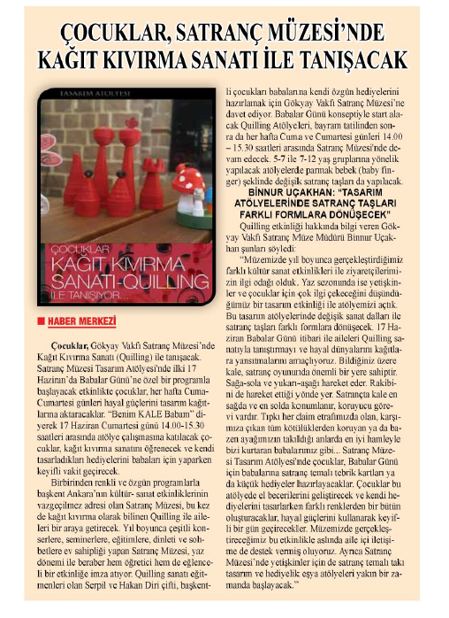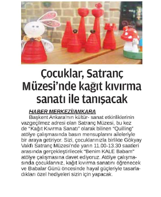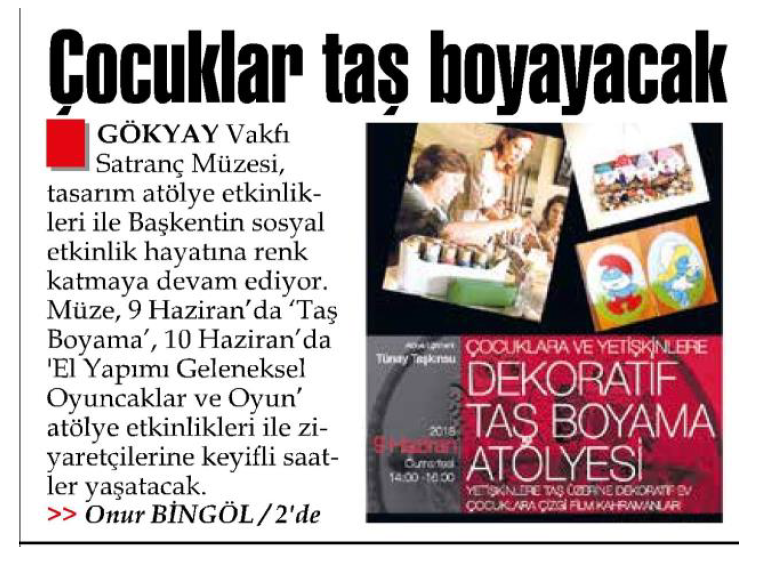 07.06.2018 / Başkent GazetesiSatranç Müzesi'nde Atölye Etkinlikleri Başlıyor