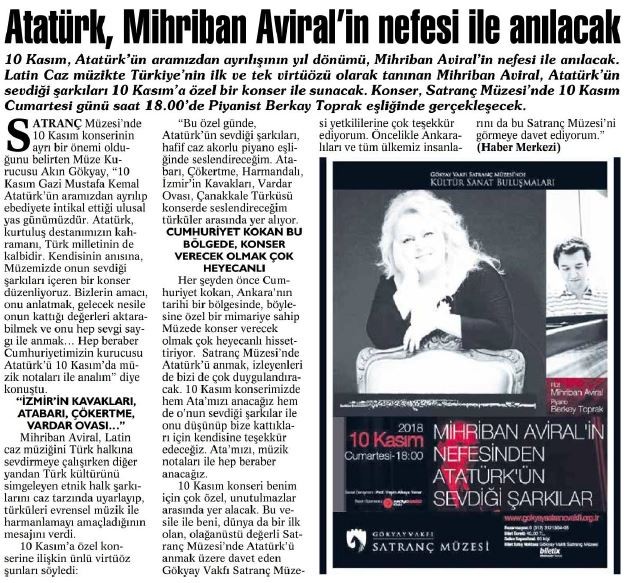06.11.2018 / Başkent GazetesiAtatürk, Mihriban Aviral'in Nefesi ile Anılacak